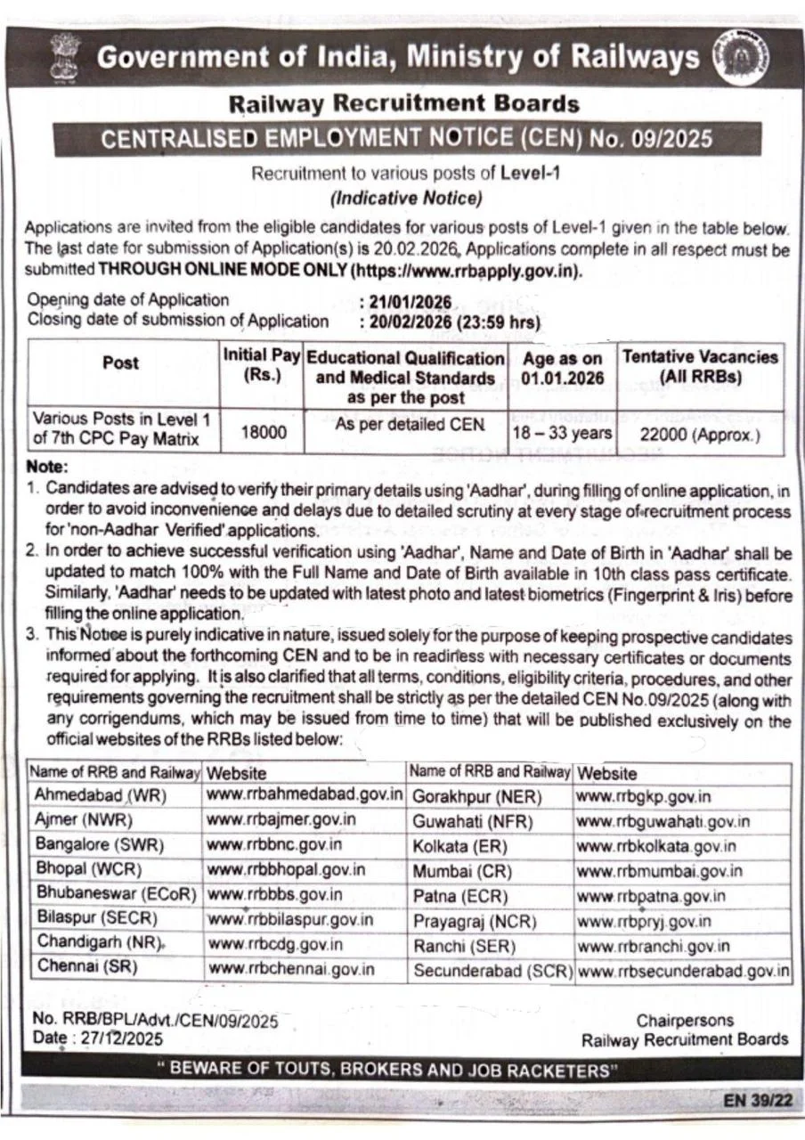 RRB Group D Recruitment 2026: Railway Recruitment Board (RRB) has released the notification CEN 01/2019 for recruitment to Level 1 posts under Group D on its official website. 0198/DR-02) recruitment 2026 : Other details like age limit, educational qualification, selection process & how to apply are given below… Dada Hormone Phuphutanki College New Job Vacancy (T. rrbapply. gov.in.